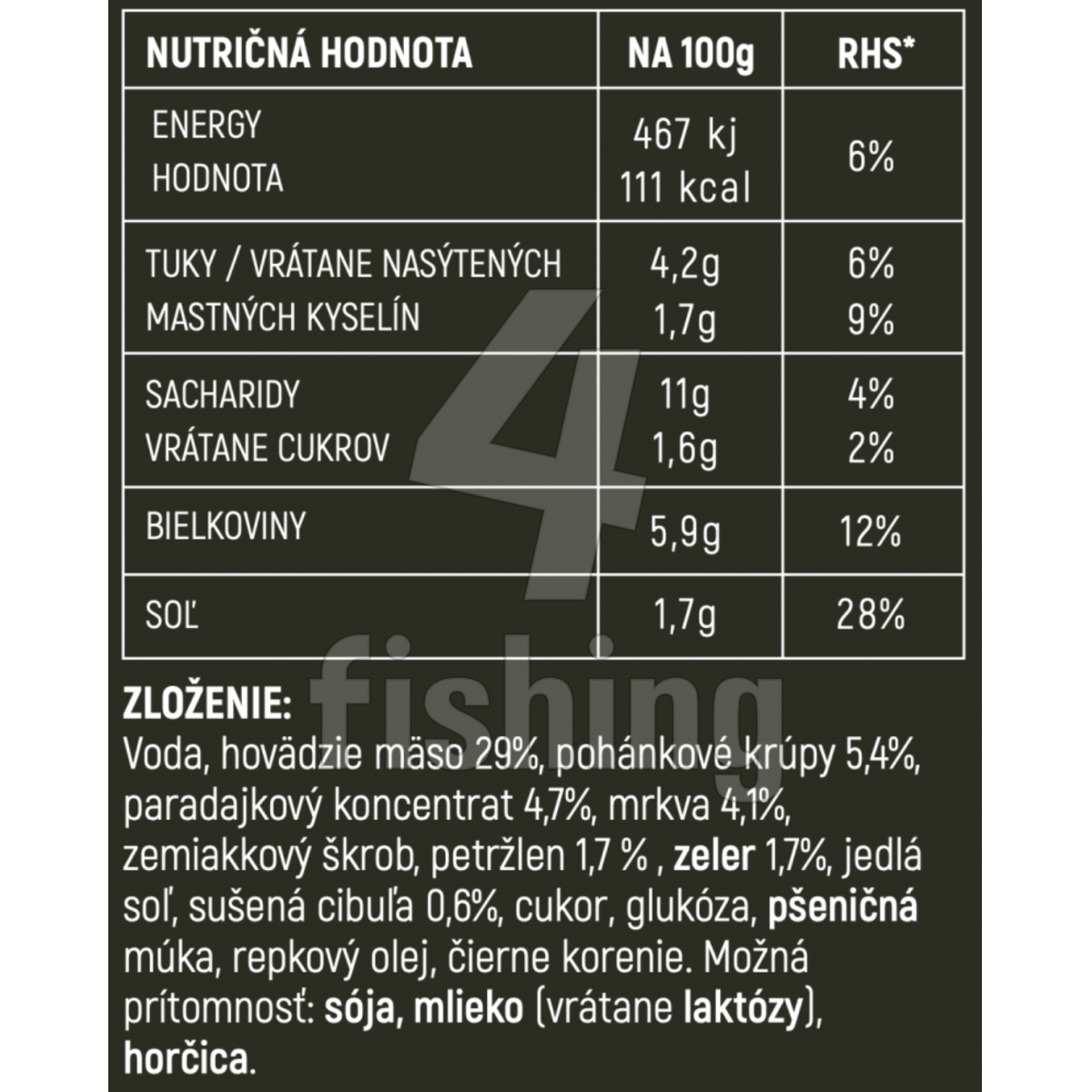 Produkt vznikol pre ľudí, ktorí chcú rýchle, výživné a chutné jedlo bez zdĺhavého varenia. Stačí ho zohriať a v priebehu pár minút získate sýtu a plnohodnotnú porciu. Pohánka dodáva vlákninu a minerály, zatiaľ čo hovädzie mäso poskytuje bielkoviny potrebné na doplnenie síl. Pikantný guláš oživuje chuť a dodáva pocit sýtosti.