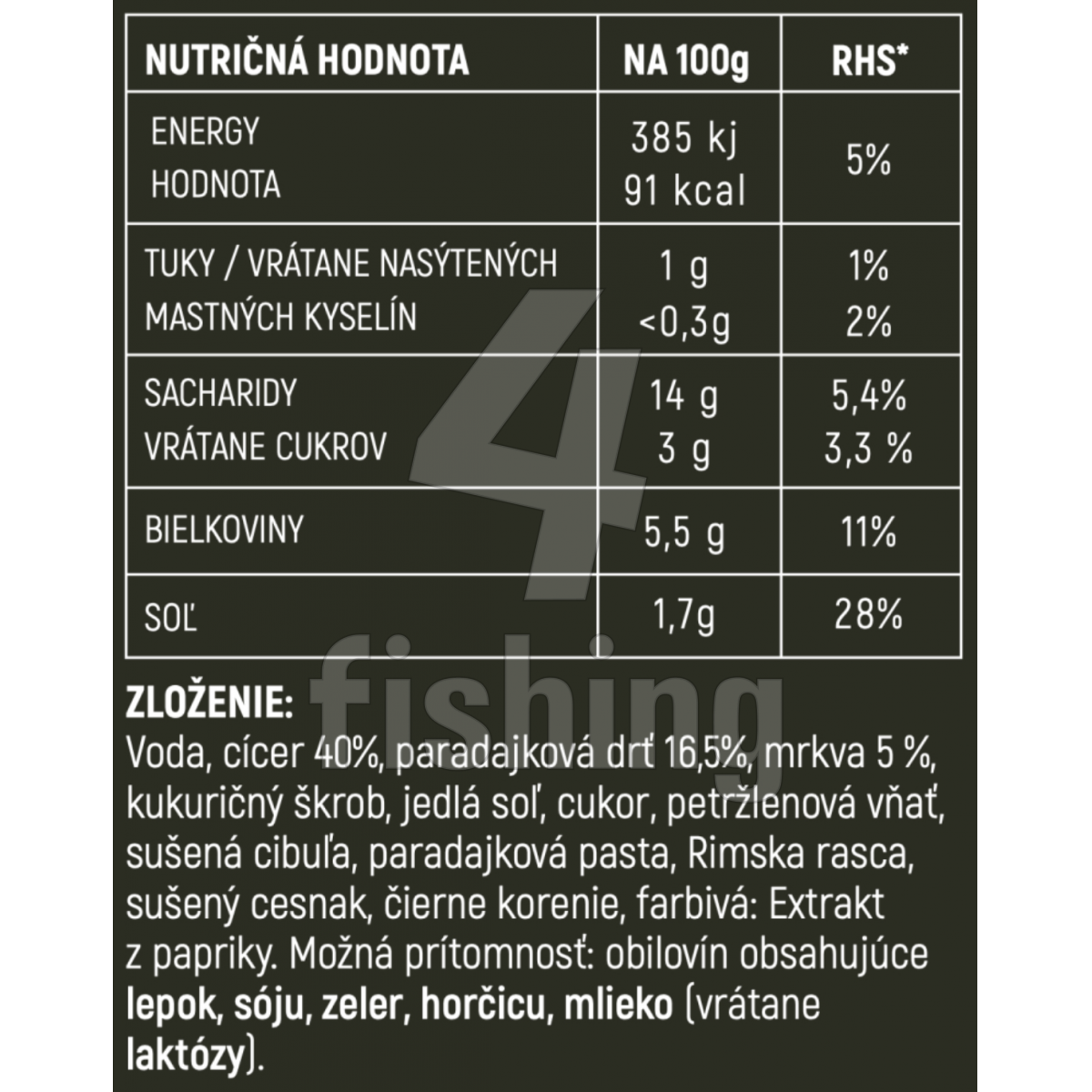 Produkt vznikol pre ľudí, ktorí chcú mať po ruke rýchle, výživné a chutné vegetariánske jedlo bez zdĺhavého varenia. Stačí ho zohriať a v priebehu pár minút získate sýtu a plnohodnotnú porciu. Zelenina dodáva vitamíny a minerály, cícer zas dôležité bielkoviny a vlákninu, zatiaľ čo jemná omáčka obohacuje chuť o vyvážený, príjemný nádych.
