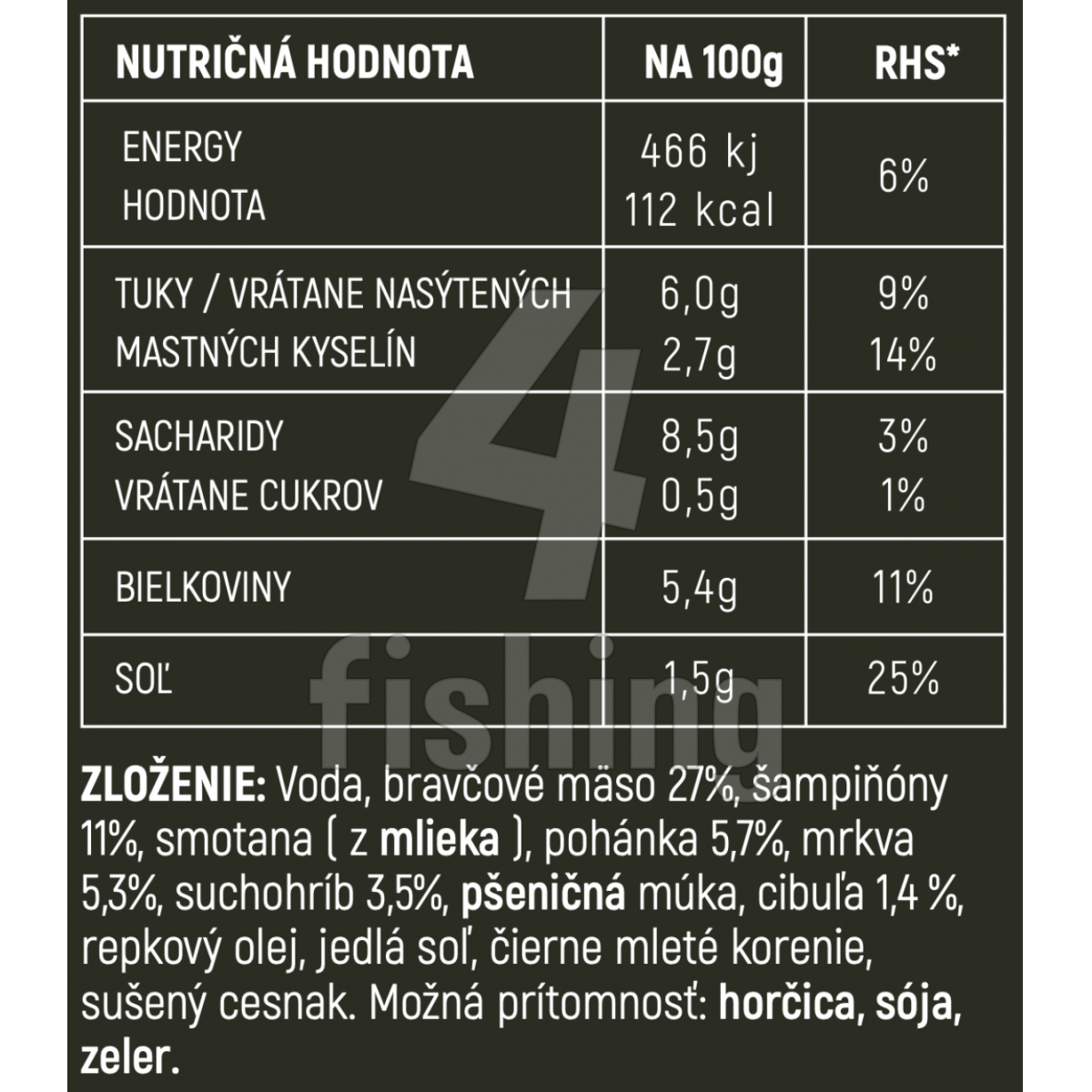 Produkt vznikol pre ľudí, ktorí chcú rýchle, výživné a chutné jedlo bez zdĺhavého varenia. Stačí ho zohriať a v priebehu pár minút získate sýtu a plnohodnotnú porciu. Kaša dodáva sacharidy potrebné pre energiu, bravčové mäso poskytuje bielkoviny a huby prinášajú jemnú lesnú chuť a dôležité minerály. Pikantný guláš oživuje chuť a dodáva pocit sýtosti.