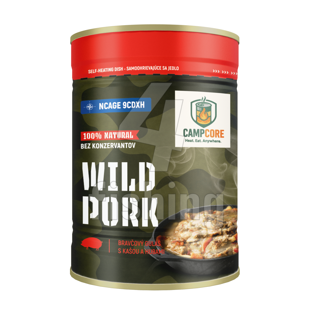 Campcore Wild Pork (Bravčový guláš s kašou a hubami) spája jemné kúsky bravčového mäsa s tradičným pikantným gulášom, nadýchanou kašou a lahodnými hubami. Tento pokrm ponúka bohatú a sýtu chuť, ktorá dodá energiu kedykoľvek a kdekoľvek. Bravčový guláš s kašou a hubami vytvára výživný základ, ktorý ocenia milovníci klasickej a lesnej chuti aj počas náročných dní.