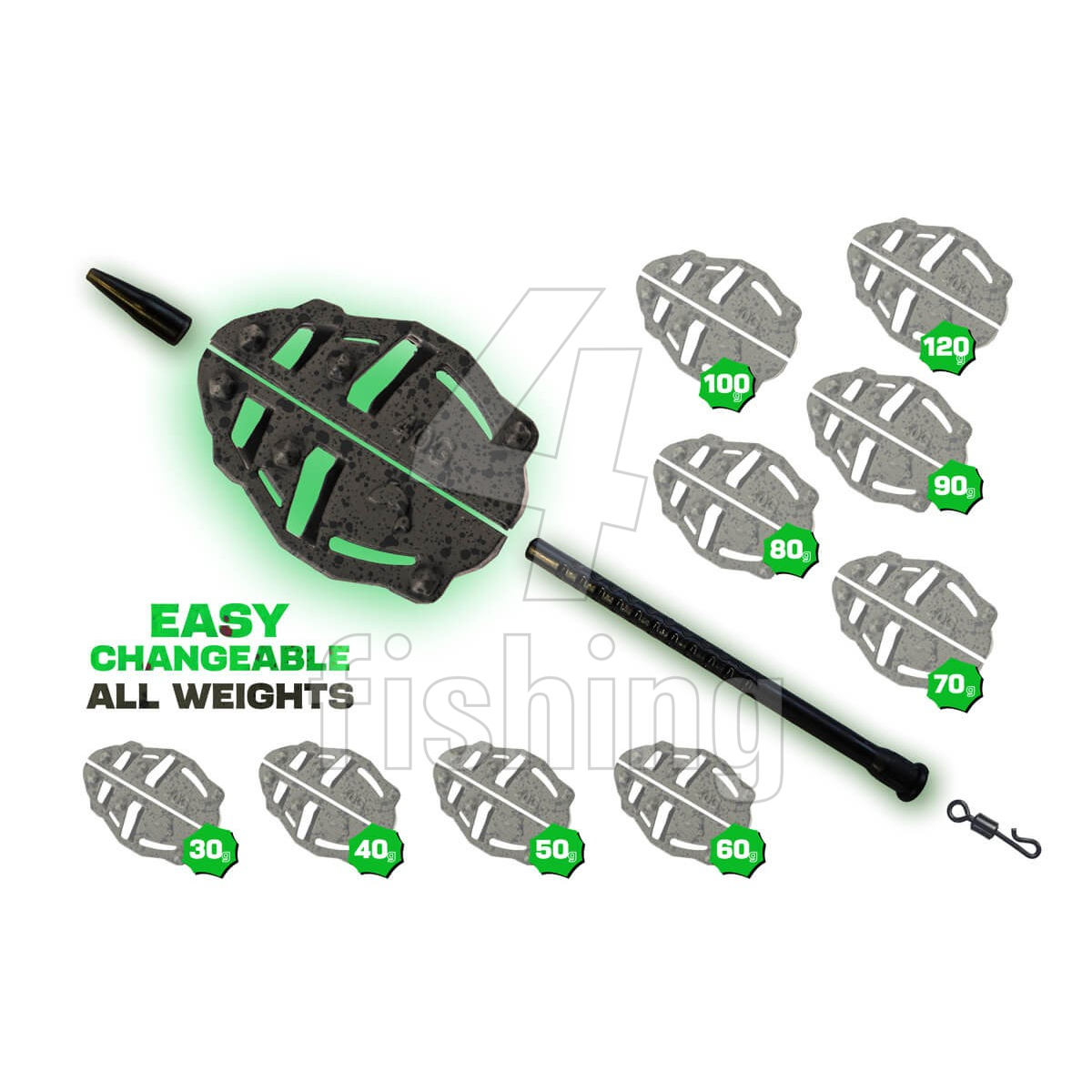 vlasec a vymeniť záťaž za inú – bez nutnosti preväzovania celej zostavy. Kŕmidlá sú vyrobené z bezolovnatého materiálu v matne zelenom